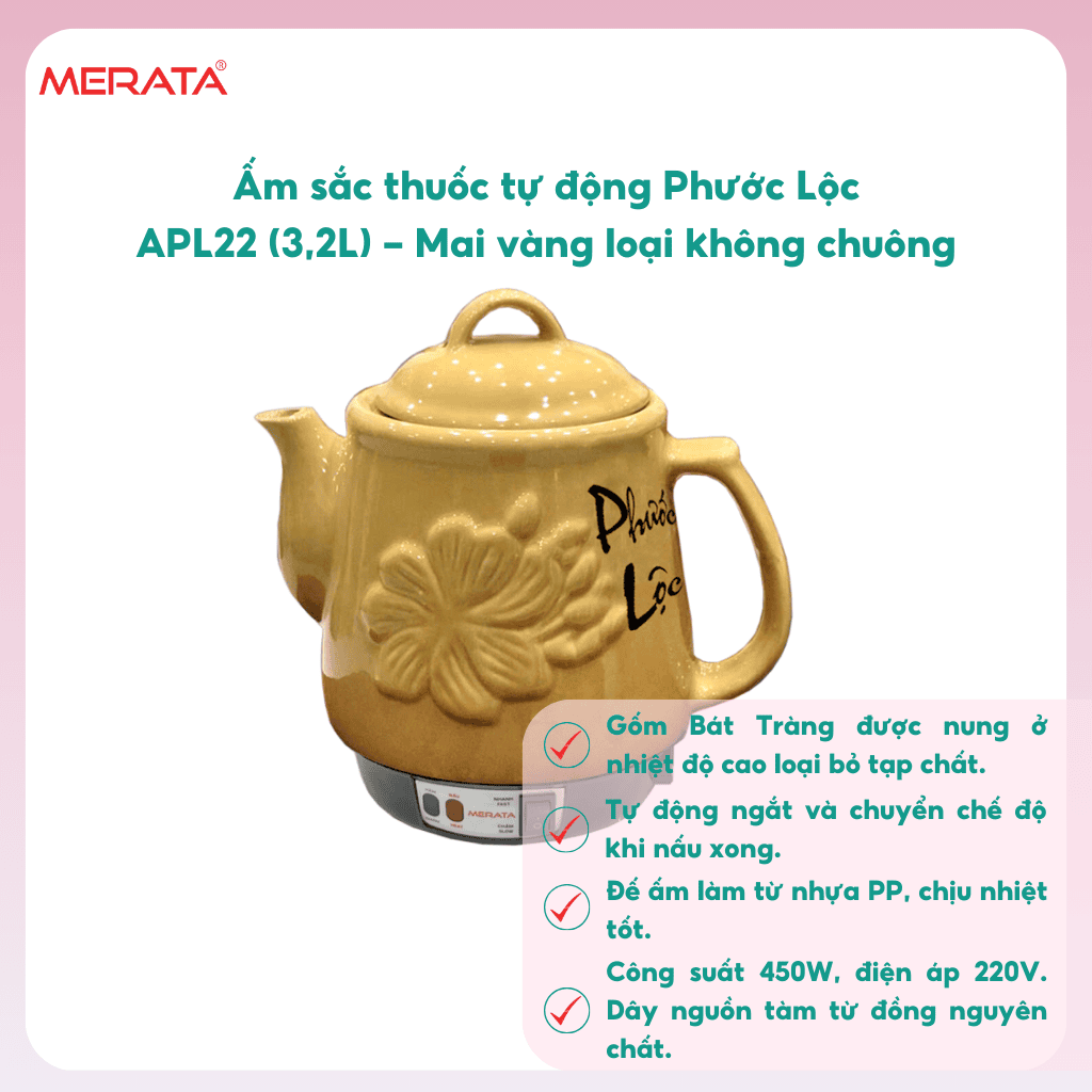 Ấm sắc thuốc tự động Phước Lộc APL22 (3,2l) – Mai vàng loại không chuông