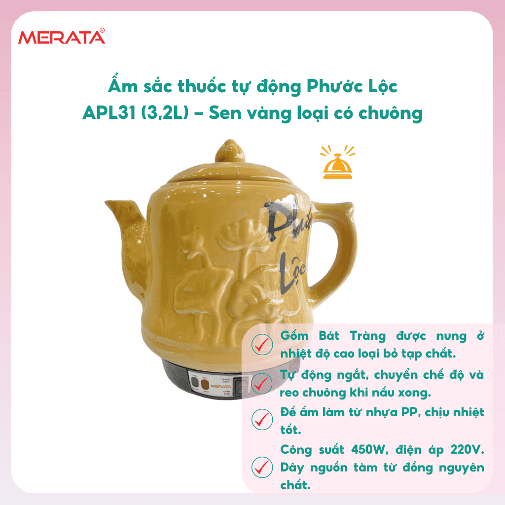 Ấm sắc thuốc tự động Phước Lộc APL31 (3,2l) – Sen vàng loại có chuông