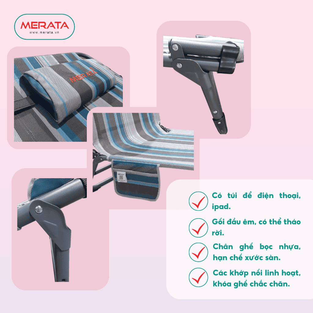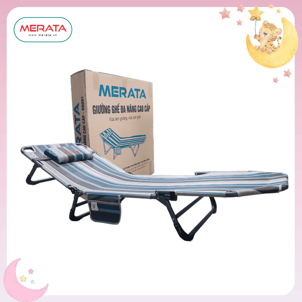 GIƯỜNG GHẾ ĐA NĂNG THÉP MERATA - GGD01 là sản phẩm gấp gọn, đa năng dùng cho nhà ở, sân vườn, hoặc có thể mang đi du lịch... và mang tính cơ động cao. Với sản phẩm này, bạn có thể vừa tựa lưng thư giãn đọc sách, đọc báo, vừa có thể dễ dàng nằm chợp mắt sau những giờ làm việc căng thẳng. Sản phẩm phù hợp và tiện sử dụng cho ông bà, bố mẹ và cả trẻ em.